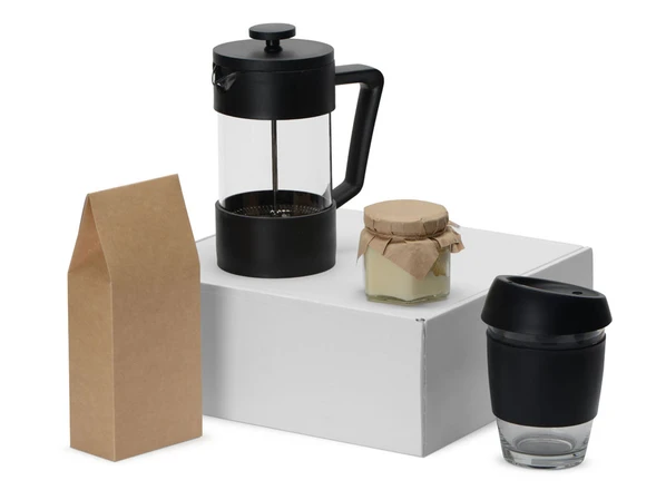 Черный набор «Бодрое утро» содержит все необходимое для действительно приятного пробуждения. В нем вы найдете все, что нужно для приготовления вашей первой чашечки кофе с утра: френч-пресс, упаковку робусты темной обжарки, стакан с силиконовыми деталями и баночку крем-меда, который составит прекрасную пару крепкому напитку.