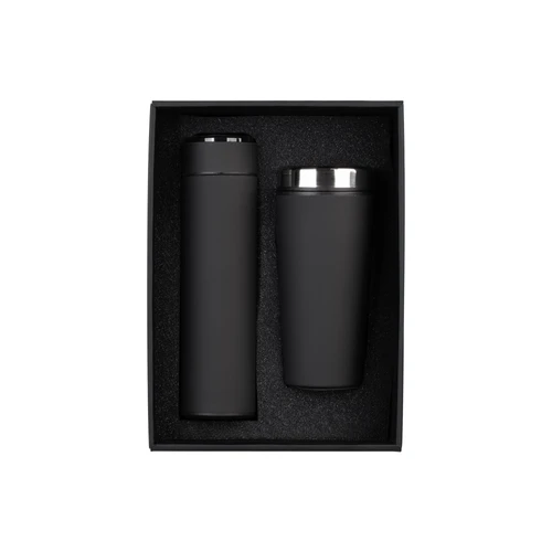 Подарочный черный набор объединяет два практичных аксессуара в современном дизайне: термос и термостакан с мягким soft touch покрытием. Модельный ряд подобран так, чтобы набор был удобен в использовании и подходил для рабочих дней, поездок и прогулок. Дополнительно комплект оформлен в подарочной коробке с ложементом, которая делает его готовым к вручению.