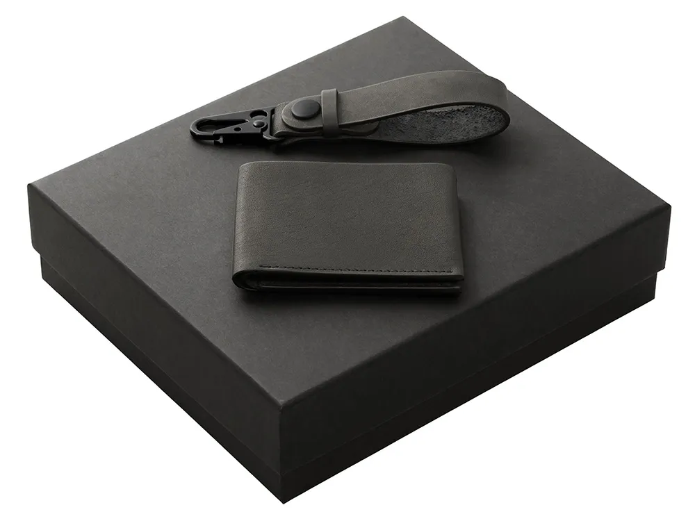Комплектация: складной бумажник, ключный ремешок с карабином. Упаковка: Стильная коробка из переплетного картона, готовая к персонализации.