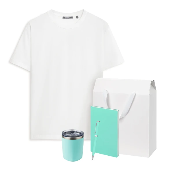 Набор Kris — стильное и функциональное решение, объединяющее одежду и аксессуары для активного образа жизни. Белая футболка в бирюзовом комплекте с канцелярией и термокружкой делает его удобным и универсальным подарком для сотрудников и партнеров.