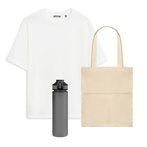 Стильный бело-серый набор с одеждой Rust сочетает комфорт и практичность. В нем есть все необходимое для активного дня — удобная футболка, вместительный шопер и бутылка для воды, которую легко брать с собой.