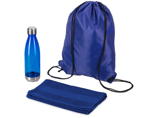 Универсальный синий спортивный набор будет актуален в любом виде спорта. Бутылка для воды позволит брать с собой не только воду, но и тонизирующие напитки или коктейли и поможет освежиться в любой момент.