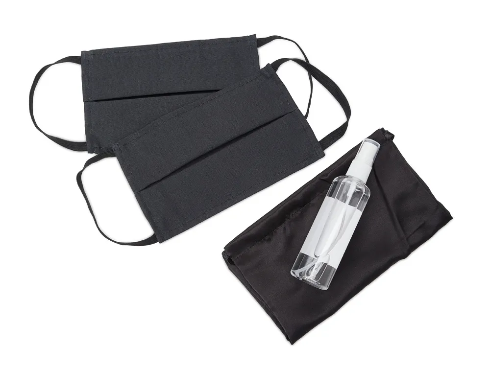 Набор включает в себя антисептик 100 мл в виде спрея с ароматом яблока и две хлопковых маски черного цвета.