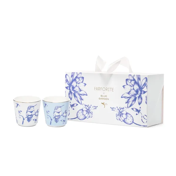 Набор из 2 кофейных стаканов Blue Garden из одноименной коллекции в подарочной коробке с ручкой-лентой и матовой ламинацией. Объем стакана — 200 мл. Декорирование золотом. Цвет — голубой и белый с синим.
