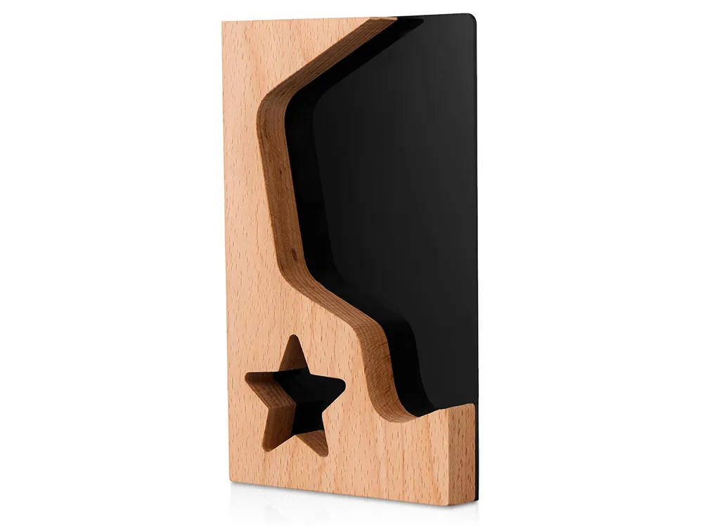 Красивая и современная награда для главных звезд любой компании. Черный акрил добавляет контраста рамке из бука, логотип или наградную надпись можно выгравировать на деревянной части или сделать уникальный дизайн, благодаря полной запечатке акрила методом УФ-печати.