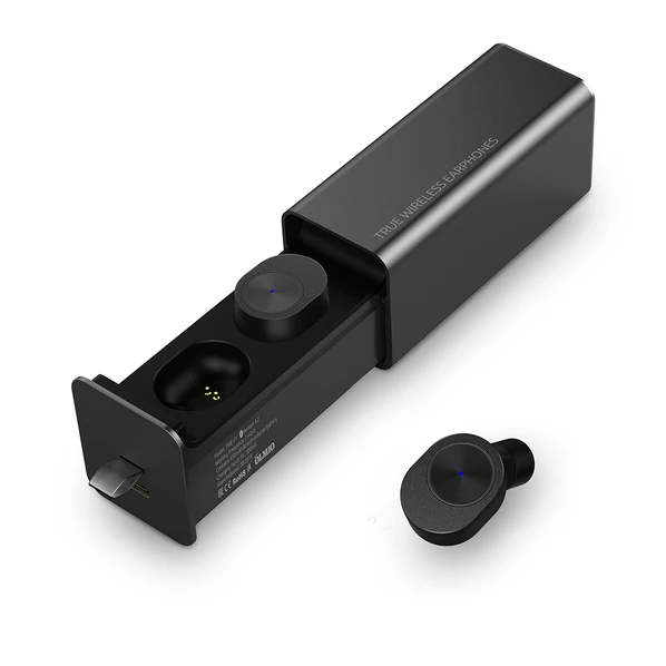 Беспроводные наушники черного цвета True Wireless Olmio TWE-01 в металлическом боксе-зарядке. Современные и максимально удобные наушники-затычки из прочного пластика. Кейс-подзарядка обеспечивает до 10 часов работы.