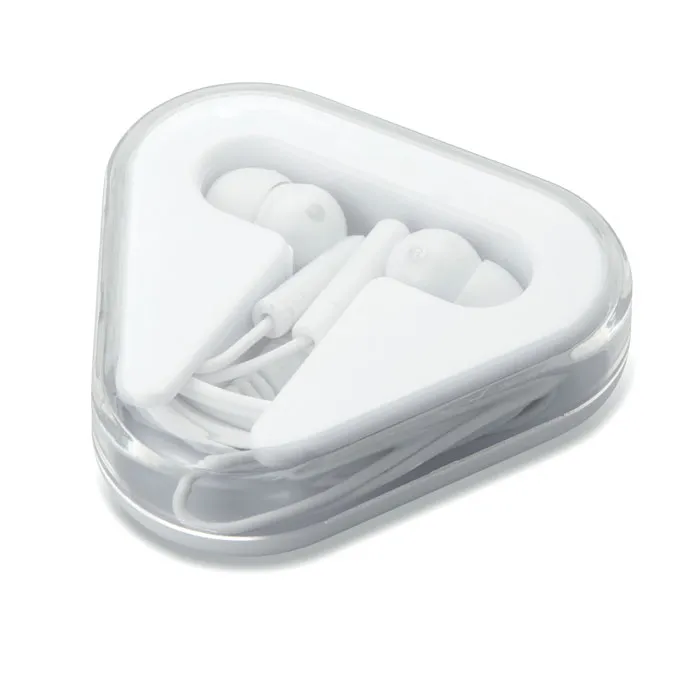 Наушники белого цвета из ПВХ в треугольном футляре из пластика. Длина кабеля 120 см.