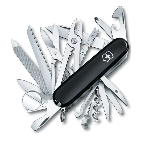 Складной перочинный нож черного цвета SwissChamp из нержавеющей стали длиной 91 мм в сложенном виде. Такому подарку обрадуется настоящий мужчина, рыбак или путешественник с многолетним опытом.