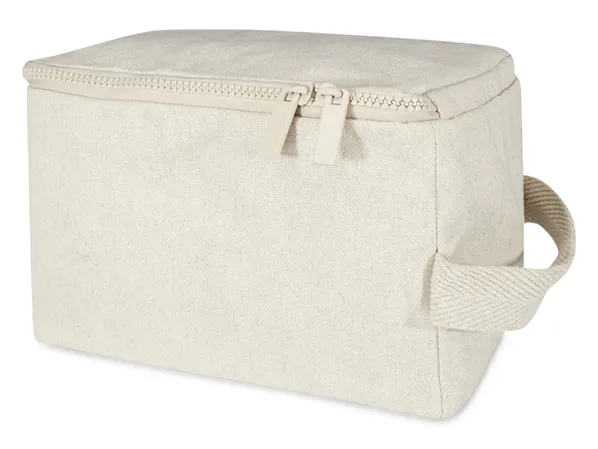 Бежевый органайзер для туалетных принадлежностей, изготовленный из переработанного хлопка и переработанного полиэстера плотностью 500 г/м², с просторным основным отделением с надежной застежкой-молнией и несколькими внутренними накладными карманами, что делает его идеальным для хранения необходимых туалетных принадлежностей.