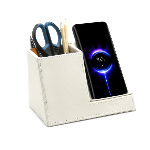 Настольный белый органайзер Ron c беспроводной зарядкой — это идеальный аксессуар для вашего рабочего стола! Этот органайзер позволит вам поддерживать порядок на столе и заряжать телефон с помощью беспроводной технологии.