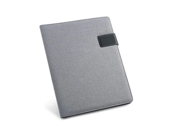 Практичная серая папка с блокнотом Riordan A4 из искусственного льна и кожзаменителя. Имеет застежку на магните с пластинкой для персонализации. Внутри имеет блокнот из 20 листов в линейку, держатель для шариковой ручки (ручка не входит в комплект), карман для смартфона и держатели для кабелей или других принадлежностей (в комплект не входят).