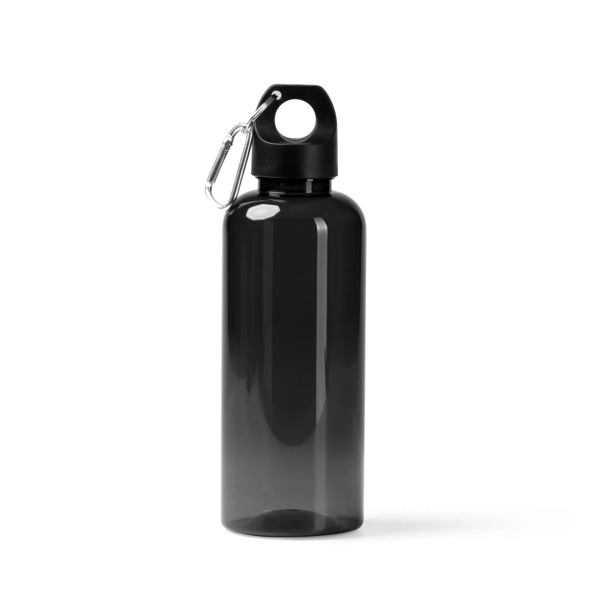 Классическая черная бутылка из пластика RPET. Крышка и ручка для переноски с карабином. Емкость: 580 мл.