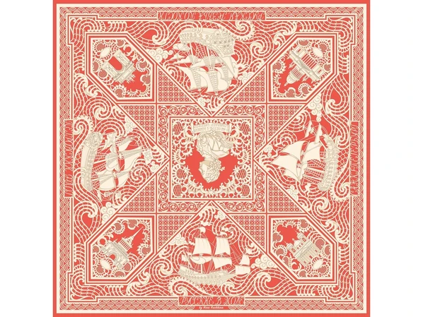 Тематика платка - Петровский Флот. В центре - декоративная резная пластина в пышном обрамлении с профилем великого русского самодержца Петра I. По углам - резные вставки с узнаваемыми архитектурными шедеврами Петербурга разных времён: "Нарвские триумфальные ворота", "Здание Главного адмиралтейства", "Троицкий собор Александро-Невской лавры", "Исаакиевский собор". Дополняют композицию петровские фрегаты, раскачивающиеся на волнах ажурного кружева.