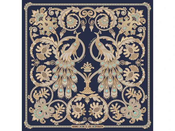 Про стройную, красиво одетую девушку говорят: «Будто пава плывет». Мы старались воссоздать в рисунке сложную фактуру древнего промысла, придав золотошвейному искусству новую форму. Желаем всем обладательницам платка «Русское золотное шитьё» наполниться энергией и тёплом посланий предков. А изысканная цветовая гамма платка сделает этот аксессуар незаменимым в гардеробе любой леди, неравнодушной к современной моде.