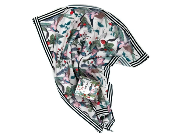 Платок из искусственного шелка саржевого плетения (твил) размером 70*70 см., с авторским принтом «Фазаны». Принт нарисован художницей вручную специально для бренда Varvara. Художница размышляла на тему русской природы, культуры и искусства - тут и лесная земляника, и сочная зелень, и сказочные зайцы с фазанами.