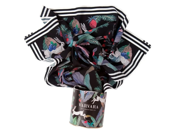 Платок из искусственного шелка размером 70*70 см., с авторским принтом «Зайцы». Принт нарисован художницей вручную специально для бренда Varvara. Художница размышляла на тему русской природы, культуры и искусства - тут и лесная земляника, и сочная зелень, и конечно, сказочные зайцы - как будто только что сошли с полотен В. Васнецова.