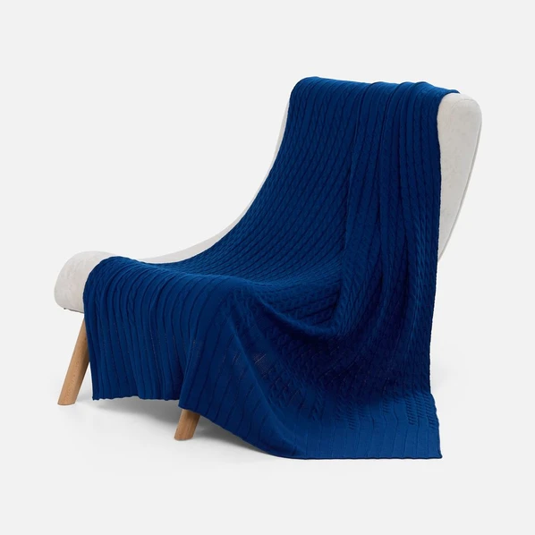 Уютный темно-синий плед со слегка обновленным классическим узором: фактурные косы разной длины плавно перетекают в ненавязчивые полосы и обратно.