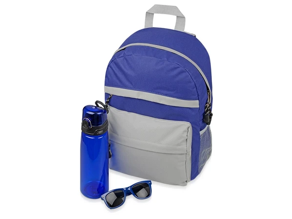 Все предметы в наборе выполнены в единой сине-серой цветовой гамме. В рюкзаке можно взять с собой на прогулку толстовку или портативную колонку, с бутылкой под рукой всегда будет запас питьевой воды, а очки защитят от слепящего солнца и придадут владельцу стильный вид.