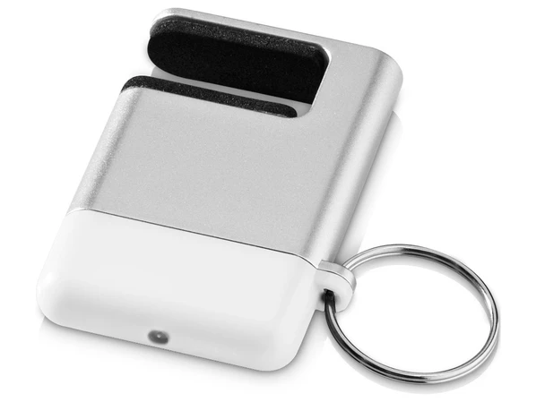 Подставка-брелок серебристо-белого цвета для мобильного телефона с губкой для чистки экрана. Функциональный промо-сувенир для продвижения цифровых устройств с сенсорным экраном: мобильных телефонов, планшетов, фотоаппаратов и т.д. Возможно нанесение изображения по вашему эскизу.