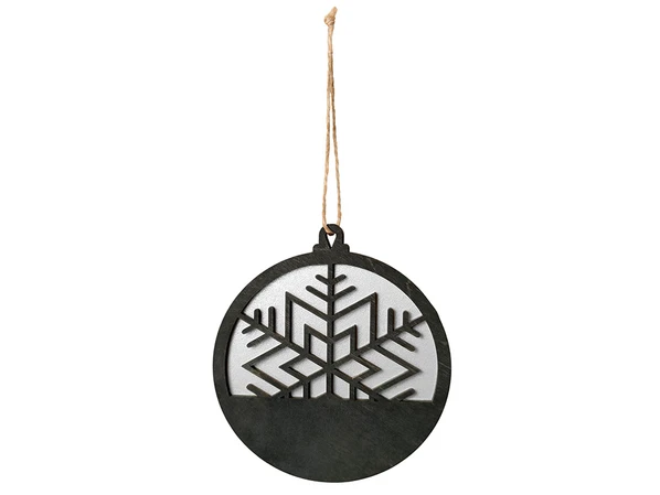 Стильная и минималистичная черная подвеска в форме снежинки выполнена из натуральной березовой фанеры. Сочетание черного и серебристого оттенков создаёт ощущение зимнего холода и утончённой простоты. Идеально подходит для украшения интерьера, ёлки или упаковки подарка.