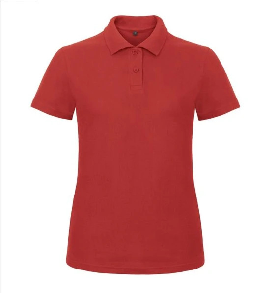 Красная женская рубашка поло из ткани пике плотностью 180 г./кв.м, с боковыми швами и усиленной планкой на 2-х пуговицах (в цвет поло), воротник связан резинкой 1х1. Вес изделия: 180 грамм.