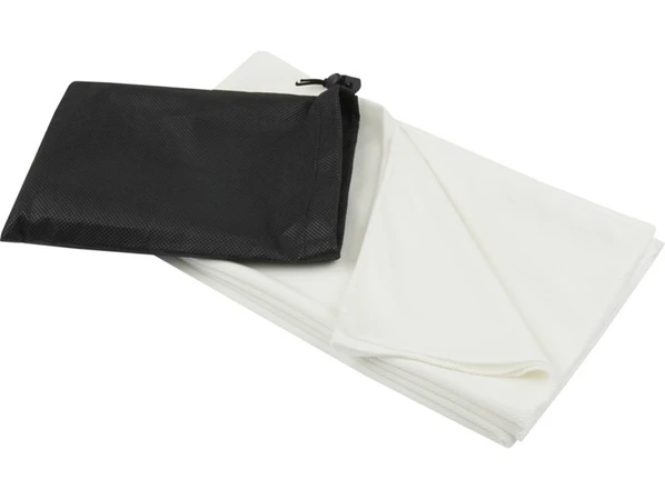Полотенце оснащено практичным пластиковым шнуром, который фиксирует как само полотенце, так и сумку, что облегчает его переноску и хранение. Поставляется в нетканом мешочке (16 x 21 см), который также изготовлен из 100% переработанного полиэстера.