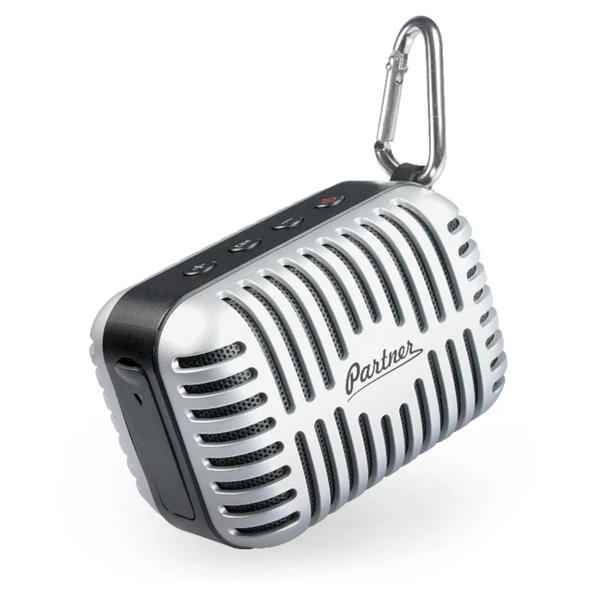 Портативная колонка черно-серого цвета Partner Marvel BT в виде ретро-микрофона. В колонке предусмотрена система синхронизации с устройством по Bluetooth, в корпусе так же есть аудиоразъем 3,5 мм и слот для microSD карты.