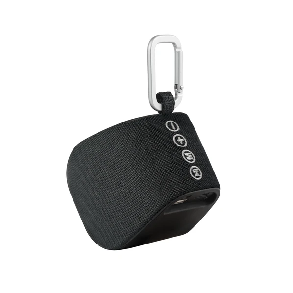 Портативная колонка на карабине Rombica Мysound BT-25. Черный матовый корпус изготовленный из пластика софт-тач с дополнительным текстильным покрытием (в том числе кнопок).
