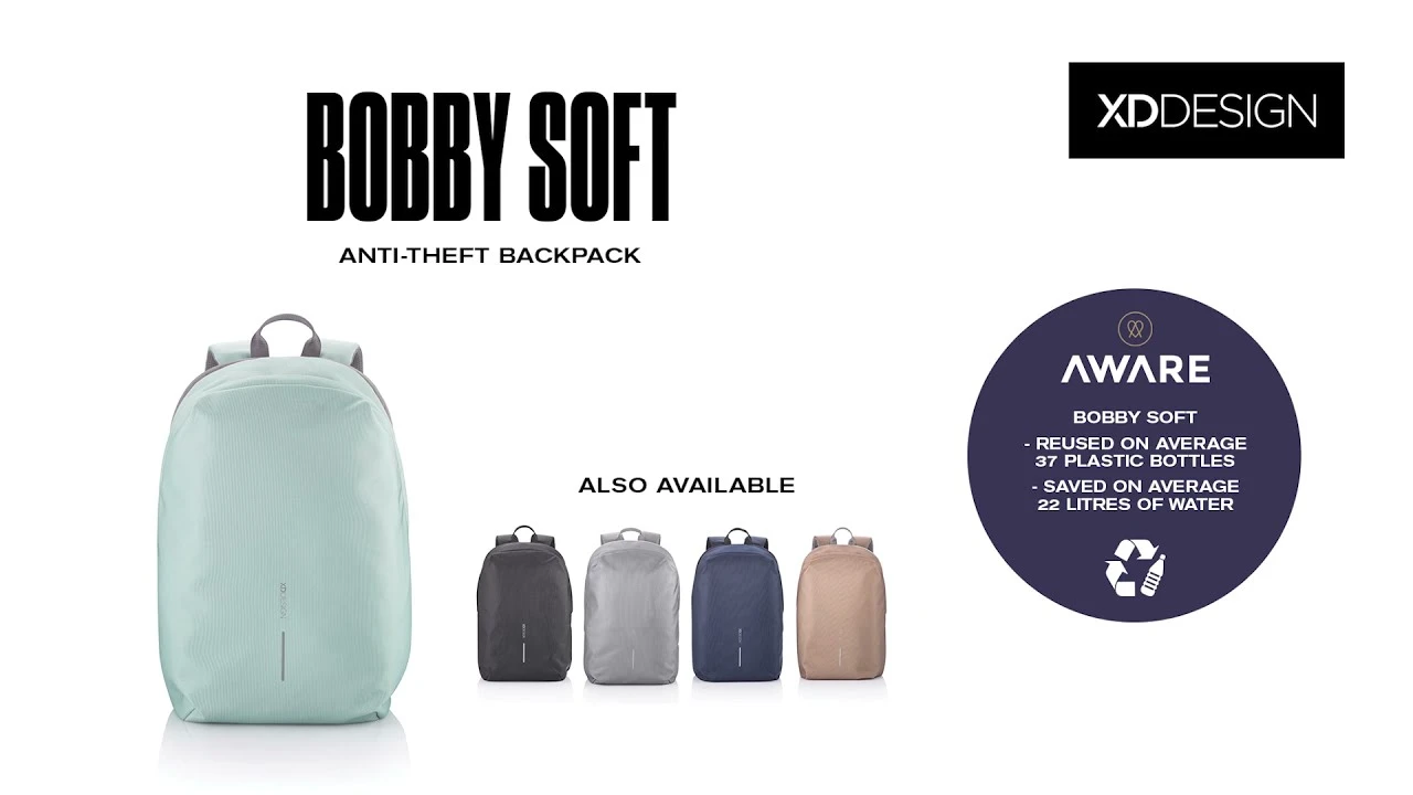 Рюкзак сделан из RPET с добавлением индикатора AWARE™. С AWARE™ вы можете быть уверены в подлинности переработанных материалов изделия и экологичности производства. При создании каждого рюкзака Bobby Soft мы сэкономили 22 литра воды и переработали 37 пластиковых бутылок. Зарегистрированный дизайн®