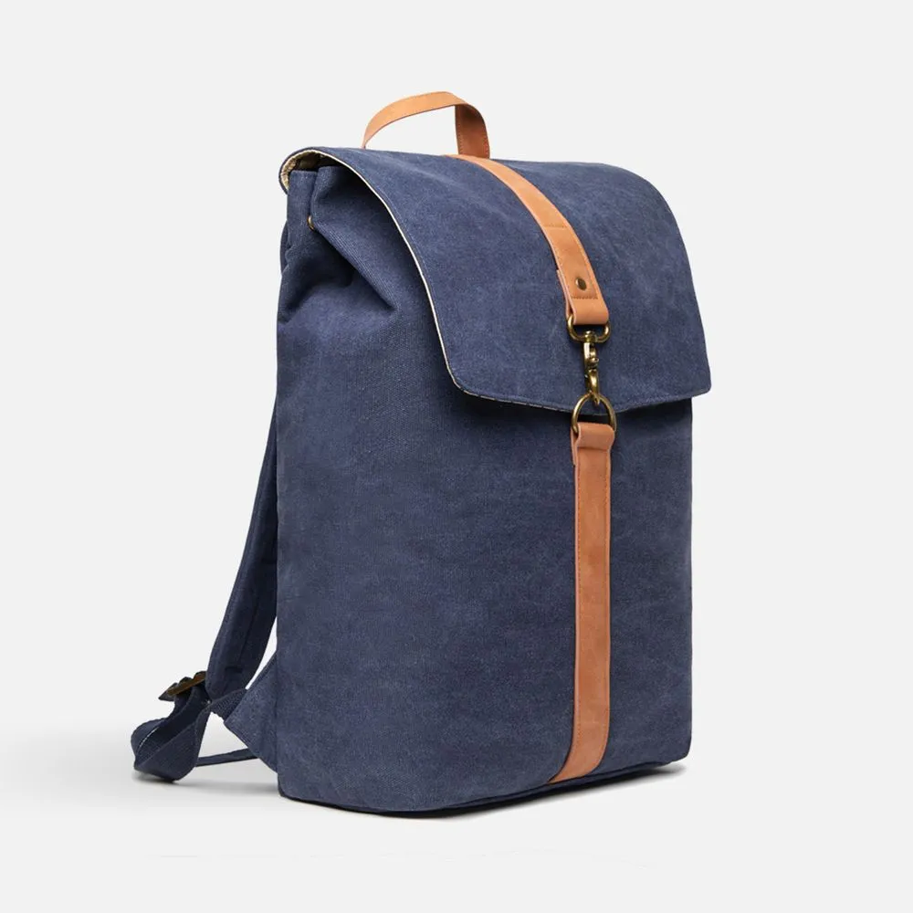 Синий рюкзак Bosler изготовлен из переработанного канваса: он не только выглядит модно, но и демонстрирует заботу об окружающей среде. Рюкзак оснащен отделением для ноутбука и привлекает внимание контрастными деталями из полиуретана и латунной фурнитурой.