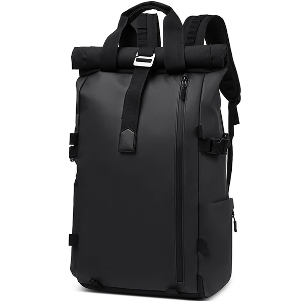 Одно большое ролл-топ отделение имеет два входа: Первый, сверху - укреплённый пластиком край рюкзака фиксируется липучками-велькро и регулируемым по длине ремеём с металлической застёжкой с возможностью увеличкения и фиксации объёма на пяти уровнях. Второй, АНТИКРАЖНЫЙ сзади - на водонепроницаемой молнии со скрытым звеном и возможностью открыва на 180 градусов.