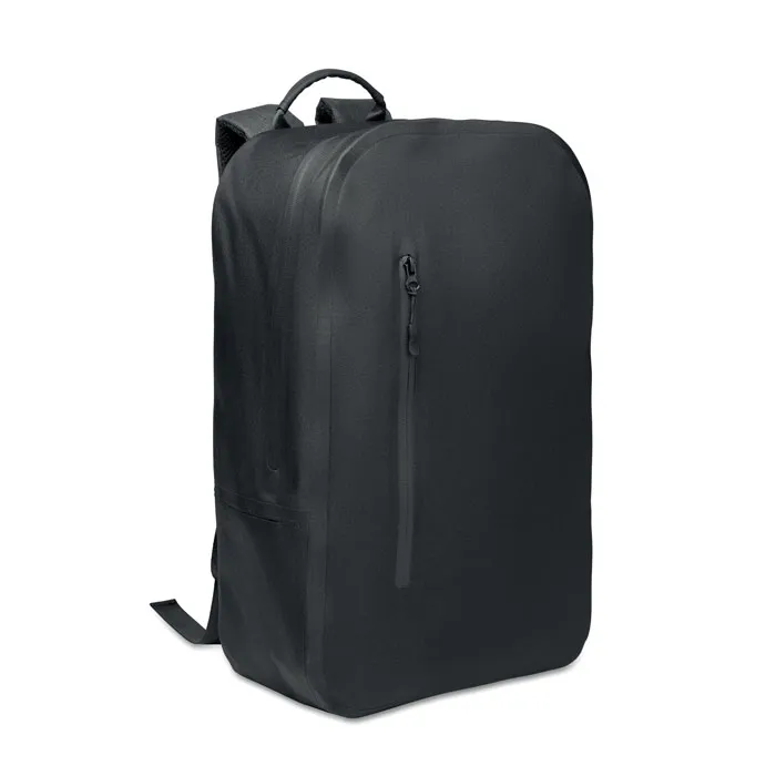 Черный рюкзак для ноутбука 16 дюймов из полиэстера RPET 300D с подкладкой из полиэстера 210D. Водонепроницаемая ткань. Потайной карман на молнии и держатель для чемодана сзади.