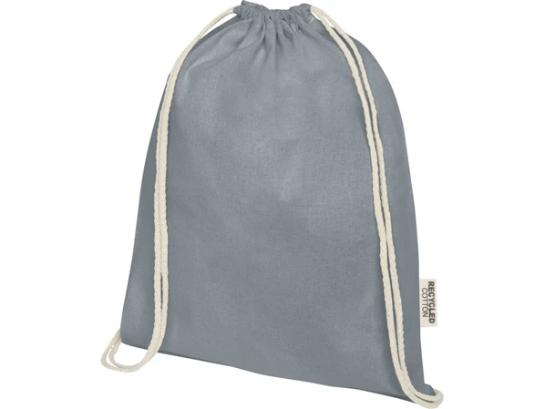 Практичный серый рюкзак-мешок Oregon. Эту сумку на шнурке, изготовленную из 100% переработанного хлопка, сертифицированного GRS, легко преподнести в качестве подарка для продвижения вашего бренда или маркетинговой кампании.