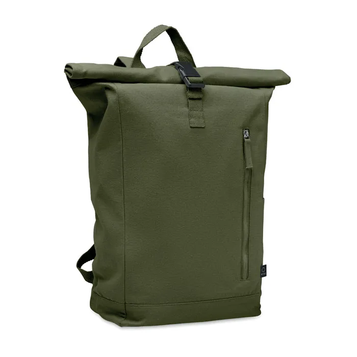 Современный зеленый рюкзак с застежкой типа Rolltop — удобный и функциональный аксессуар для города и офиса. Выполнен из плотного переработанного хлопка (80%) и полиэстера (20%) плотностью 390 г/м². Стильный дизайн и удобная конструкция делают его подходящим как для повседневной носки, так и для корпоративных подарков с акцентом на экологичность.