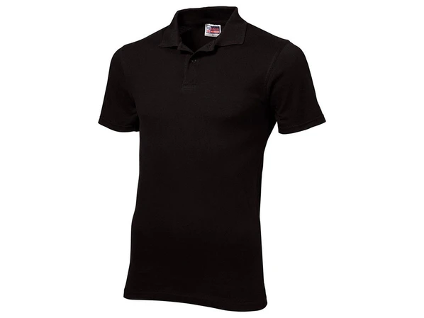 Черная мужская рубашка поло First производства бренда US Basic. Воротник 1х1 дополнен внутренней обшивкой внутри для максимальной плотности стойки. Модель оснащена двумя брендированными пуговицами для удобства регулировки глубины выреза. Пике, 100% хлопок. 160 г/м².