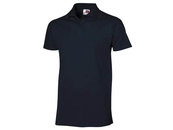Темно-синяя мужская рубашка поло First производства бренда US Basic. Воротник 1х1 дополнен внутренней обшивкой внутри для максимальной плотности стойки. Модель оснащена двумя брендированными пуговицами для удобства регулировки глубины выреза.