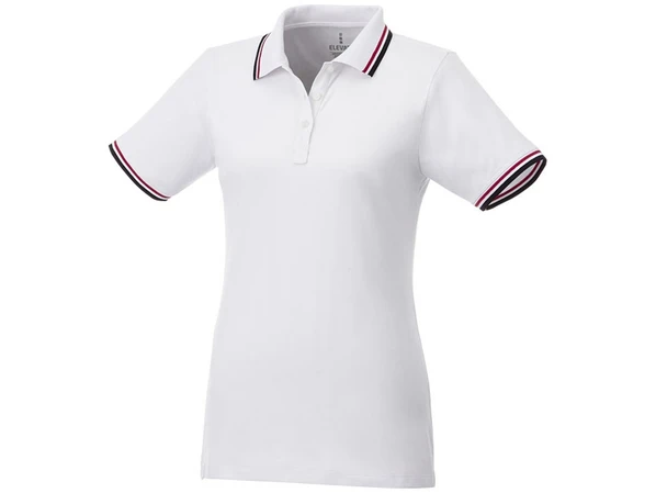 Белая женская футболка поло Fairfield с короткими рукавами, дополненными проклейкой. Воротник и манжеты изделия выполнены в стиле гладкой вязкой в рубчик. Гравированные пуговицы изготовлены в тон изделия. Комфортный ярлык-трансфер на изделии.