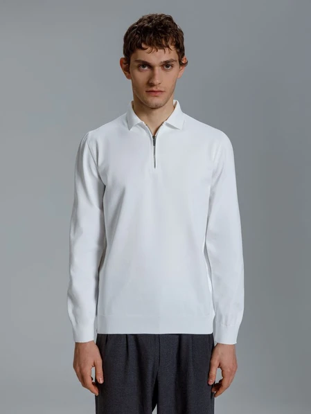 Модная белая рубашка поло из гладкого полотна идеально садится по фигуре. Металлическая молния на планке делает образ современным и лаконичным.
