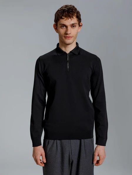 Модная черная рубашка поло из гладкого полотна идеально садится по фигуре. Металлическая молния на планке делает образ современным и лаконичным.