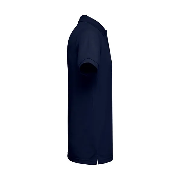 Мужская темно-синяя рубашка поло из смесовой ткани-пике. Полотно футболки упругое и гладкое благодаря обработке ферментами enzyme wash и сохраняет форму при стирке.