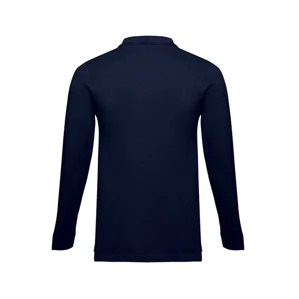 Мужская темно-синяя рубашка поло с длинным рукавом из хлопковой ткани-пике. Полотно футболки упругое и гладкое благодаря обработке ферментами enzyme wash и сохраняет форму при стирке.
