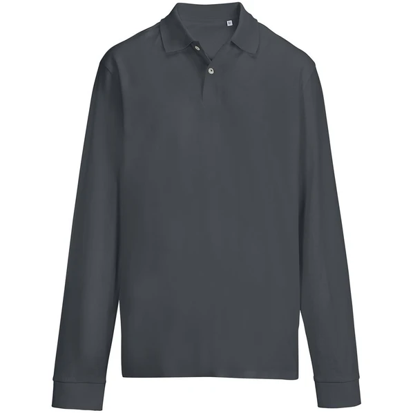 Плотная темно-серая рубашка поло унисекс с длинным рукавом из гребенного хлопка. Благодаря тонким и длинным волокнам хлопка материал отличается гладкостью, ровностью и прочностью, отлично сохраняет форму, не деформируется и не выцветает при стирке.