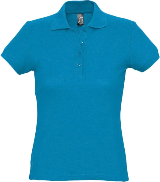 Ярко-бирюзовая женская рубашка поло Passion 170. Приталенный женственный силуэт, низ изделия прямой с боковыми разрезами. Воротник в резинку, укрепляющая тесьма по вороту, плоская резинка по рукаву.