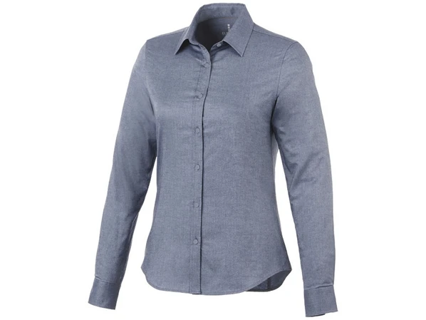Женская рубашка «Vaillant» с длинными рукавами выполнена из плотной и дышащей ткани насыщенного синего цвета. Продуманный крой включает небольшие выточки на спине для более элегантного облегания фигуры в районе талии. Конструкция воротника дополнена сатиновой лентой по периметру внутренней части ворота.