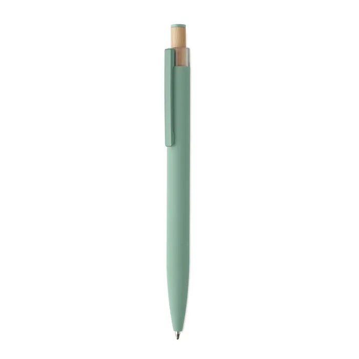 Шариковая зеленая ручка из переработанного алюминия с кнопкой из бамбука с цветными деталями и металлическим клипом.