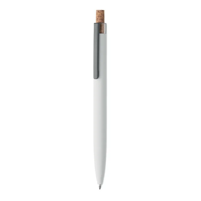 Шариковая белая ручка из переработанного алюминия с пробковой кнопкой и металлическим зажимом.