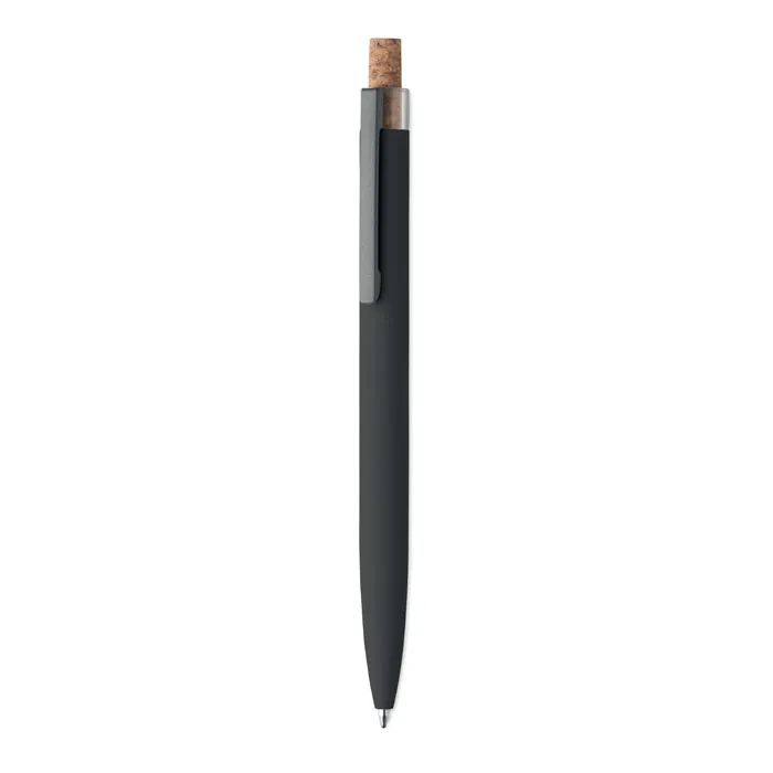 Шариковая черная ручка из переработанного алюминия с пробковой кнопкой и металлическим зажимом.