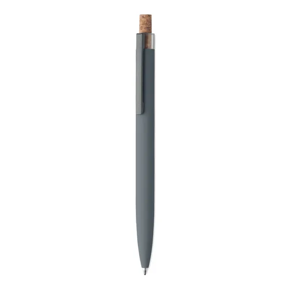 Шариковая серая ручка из переработанного алюминия с пробковой кнопкой и металлическим зажимом.