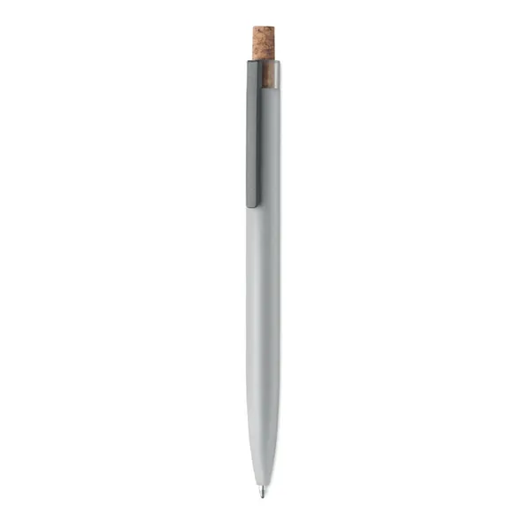 Шариковая серебристая ручка из переработанного алюминия с пробковой кнопкой и металлическим зажимом.