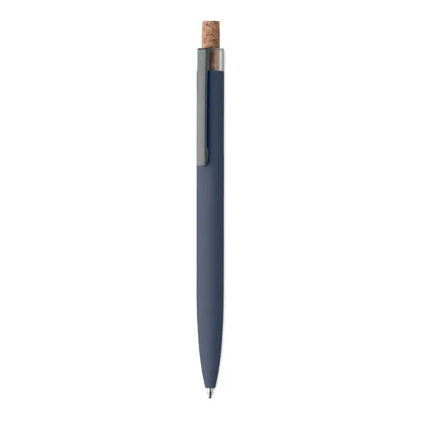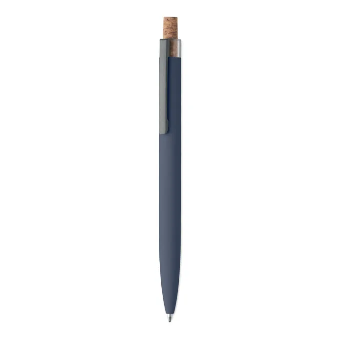 Шариковая темно-синяя ручка из переработанного алюминия с пробковой кнопкой и металлическим зажимом.